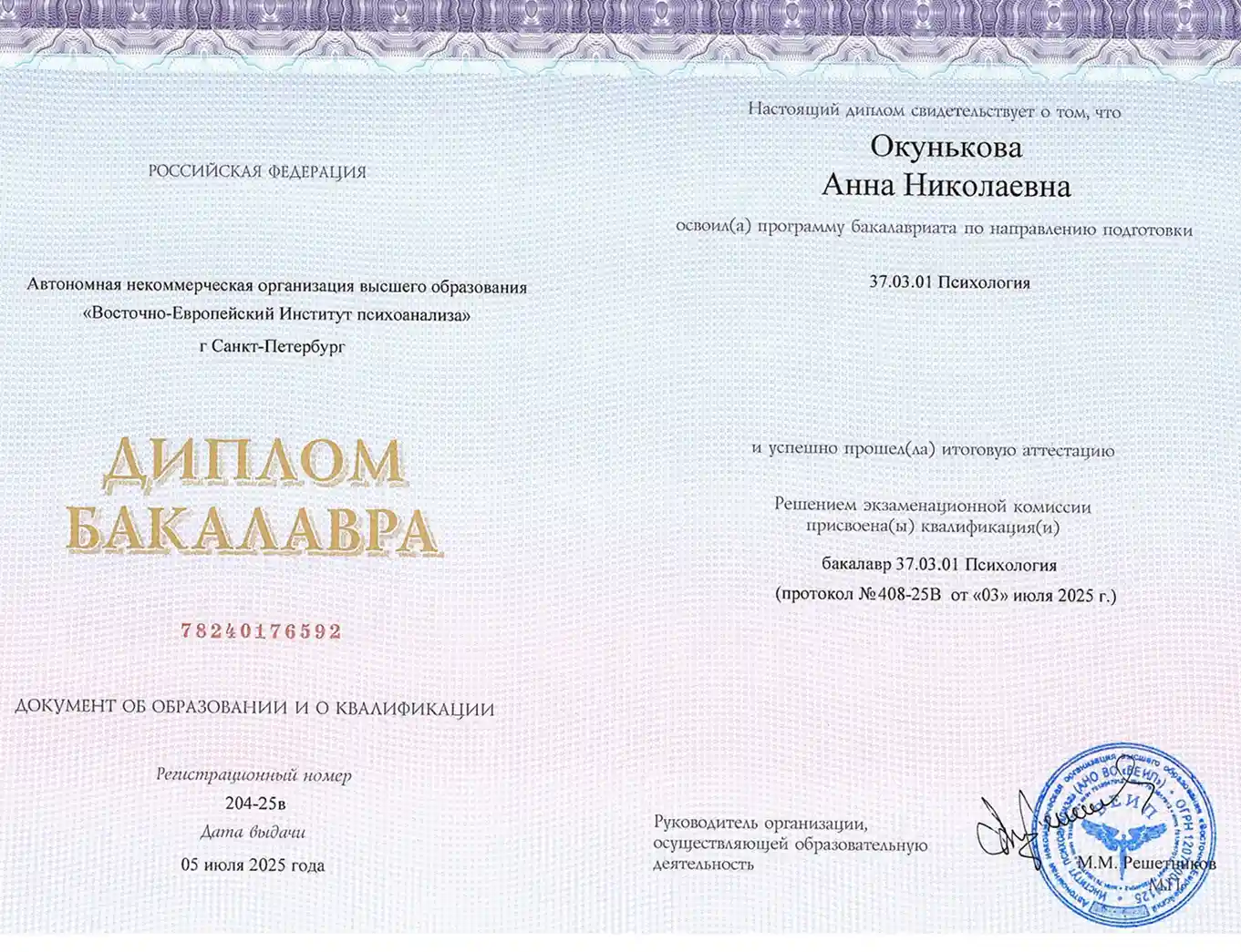 • 2015 - Институт экономики и управления в медицине и социальной сфере ( Диплом о профессиональной переподготовке по программе "Психология. Специализация - Клиническая психология")